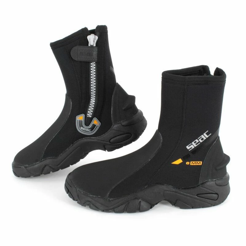 Grâce à la fermeture latérale avec une fermeture-éclair en acier inoxydable et une sangle en velcro, les bottillons Seac Pro HD peuvent être portés et retirés rapidement.