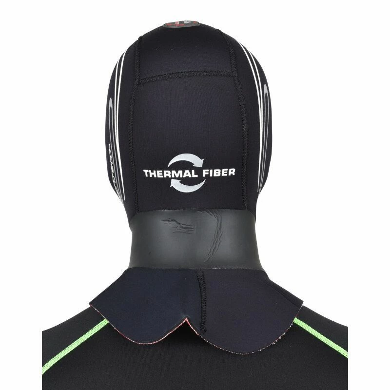 Néoprène super élastique 5 mm Ultraflex/fibre thermique. Extérieur lisse au niveau du cou, pour garantir une meilleure adhérence à la combinaison. La soupape « Air Release » permet d’évacuer l’air.