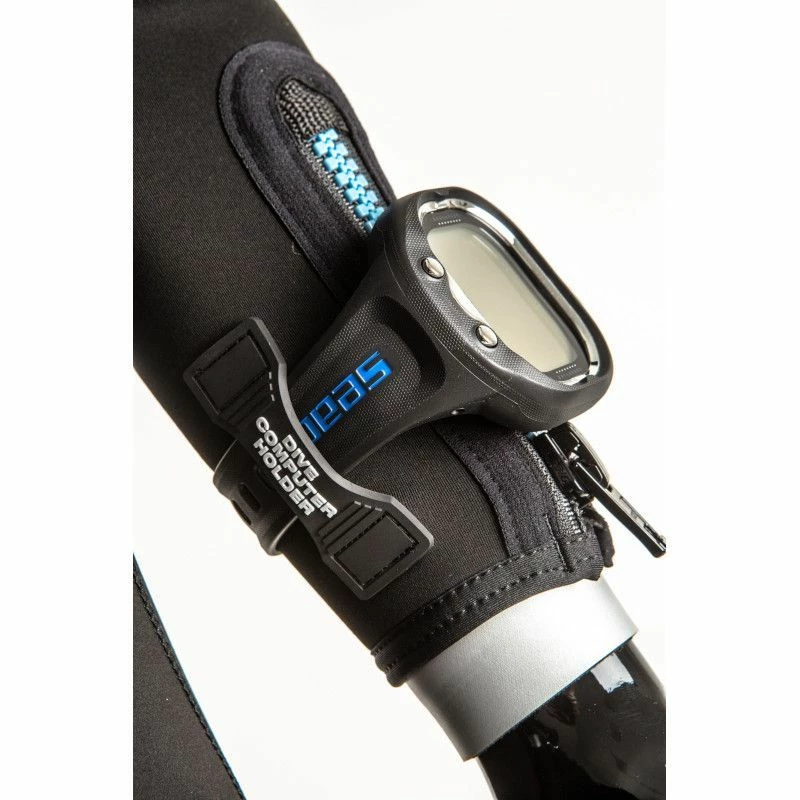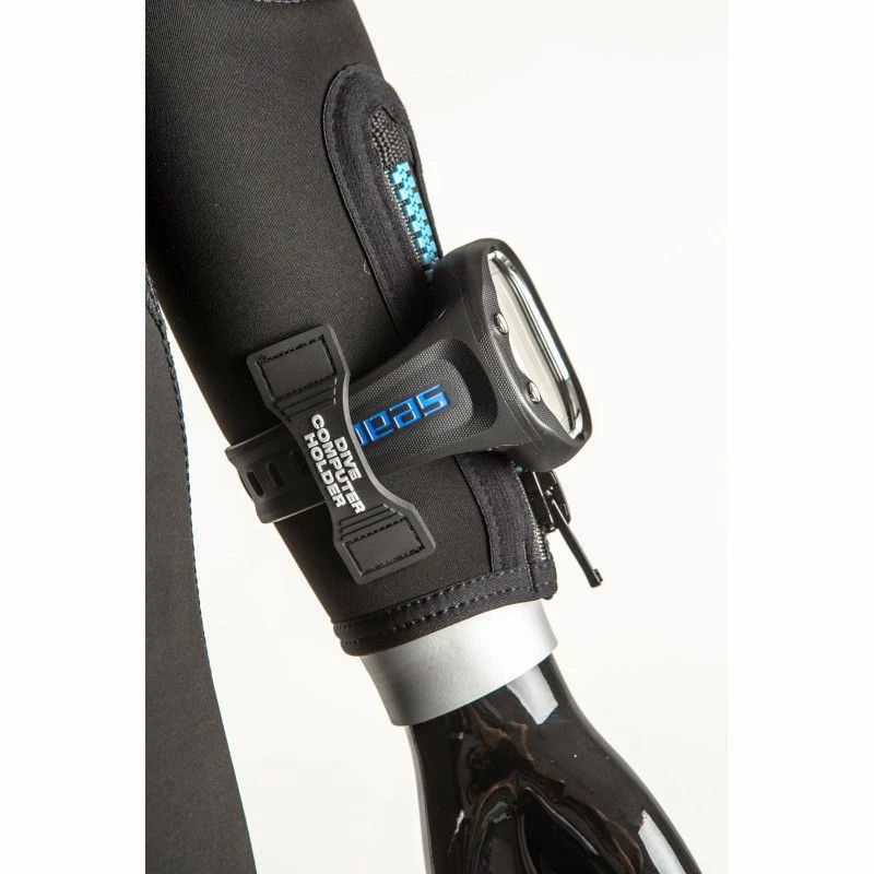 Sur le poignet gauche, il a été inséré une pratique en caoutchouc boutonnières pour maintenir fermement l’ordinateur de plongée au poignet.