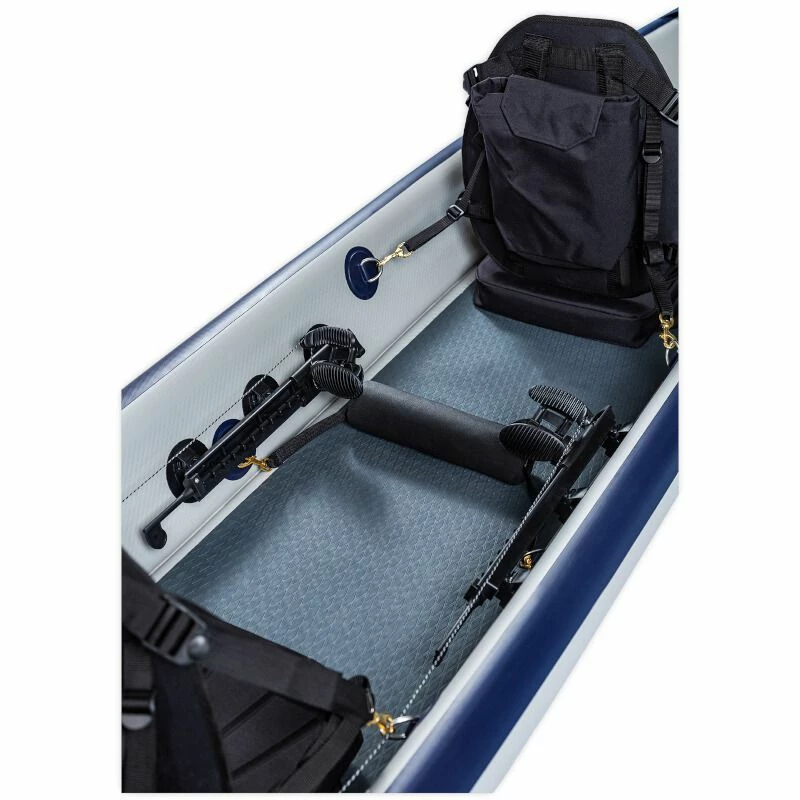 Il est livré de série avec un équipement et des finitions de qualité : deux sièges dessinés avec un dossier haut qui assurent un très bon maintien du dos et une assise confortable. Un pont recouvert d’un pad EVA vous garantit un maximum de confort. Deux cale-pieds sur sangles viennent compléter cet équipement pour pagayer efficacement lors de longues randonnées. Son système de gouvernail ingénieux permet de maintenir son cap facilement ou de piloter le kayak grâce au système de cale-pieds.
