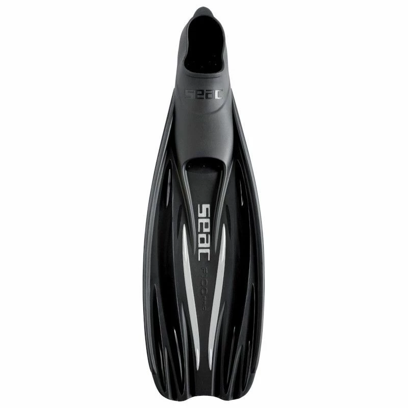 a palme Seac F 100 PRO est conçue pour un usage récréatif mais elle présente aussi beaucoup de caractéristiques des palmes professionnelles : chausson anatomique en caoutchouc thermoplastique qui maintient la palme bien ferme à chaque mouvement, Semelle de la chaussure avec inserts en caoutchouc antidérapants.
